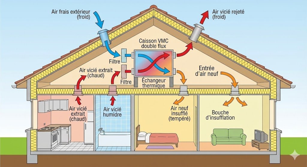💡 Bon à savoir : La VMC double flux est particulièrement intéressante dans un logement bien isolé, car elle permet de mieux préserver la chaleur intérieure tout en renouvelant l’air.