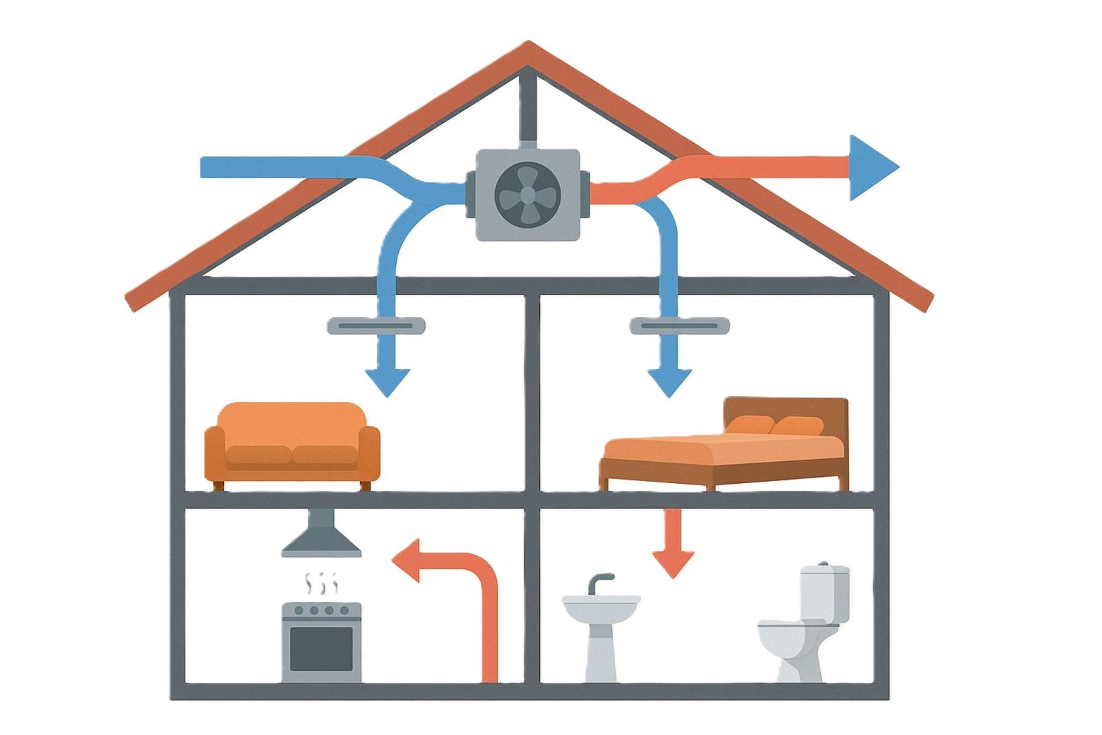 La VMC est un équipement conçu pour renouveler l’air intérieur d’un logement de manière mécanique et continue. Son rôle est double : faire entrer de l’air neuf dans les pièces de vie et extraire l’air vicié, chargé en humidité et en polluants, depuis les pièces techniques comme la cuisine, la salle de bain ou les sanitaires.